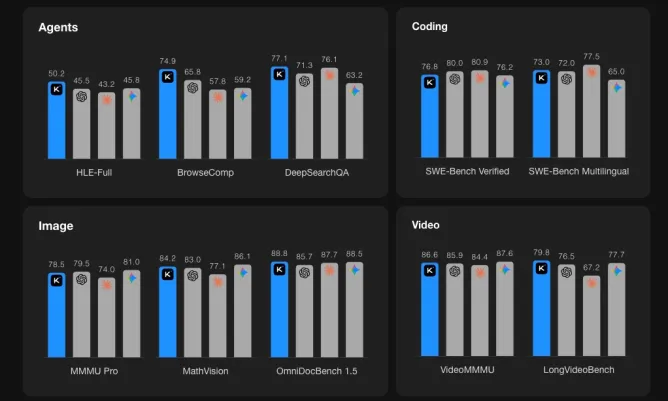 For instance, in the coding benchmark, the Kimi K2.5 outperforms Gemini 3 Pro at the SWE-Bench Verified benchmark and scores higher than GPT 5.2 and Gemini 3 Pro on the SWE-Bench Multilingual benchmark. In video understanding, it beats GPT 5.2 and Claude Opus 4.5 on VideoMMMU (video massive multi-discipline multimodal understanding), a benchmark that measures how a model reasons over videos.