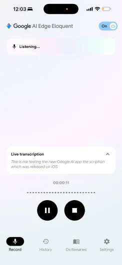 The app is free to download, and once its Gemma-based automatic speech recognition (ASR) models are downloaded, you can start dictating on your phone. In the app, you can see the live transcription, and when you hit pause, the app automatically filters out filler words like “um” and “ah” and polishes the text.