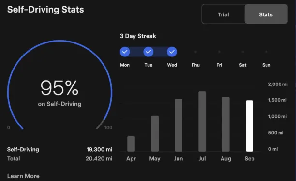 This updated app will display a couple of graphics, including the FSD usage in a bar chart. It will also track and display user “streaks,” showing how many consecutive days FSD was used.